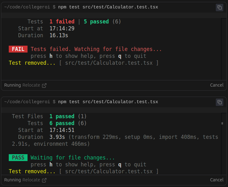 - npm test – run: Runs the Vitest suite once (not in watch mode).